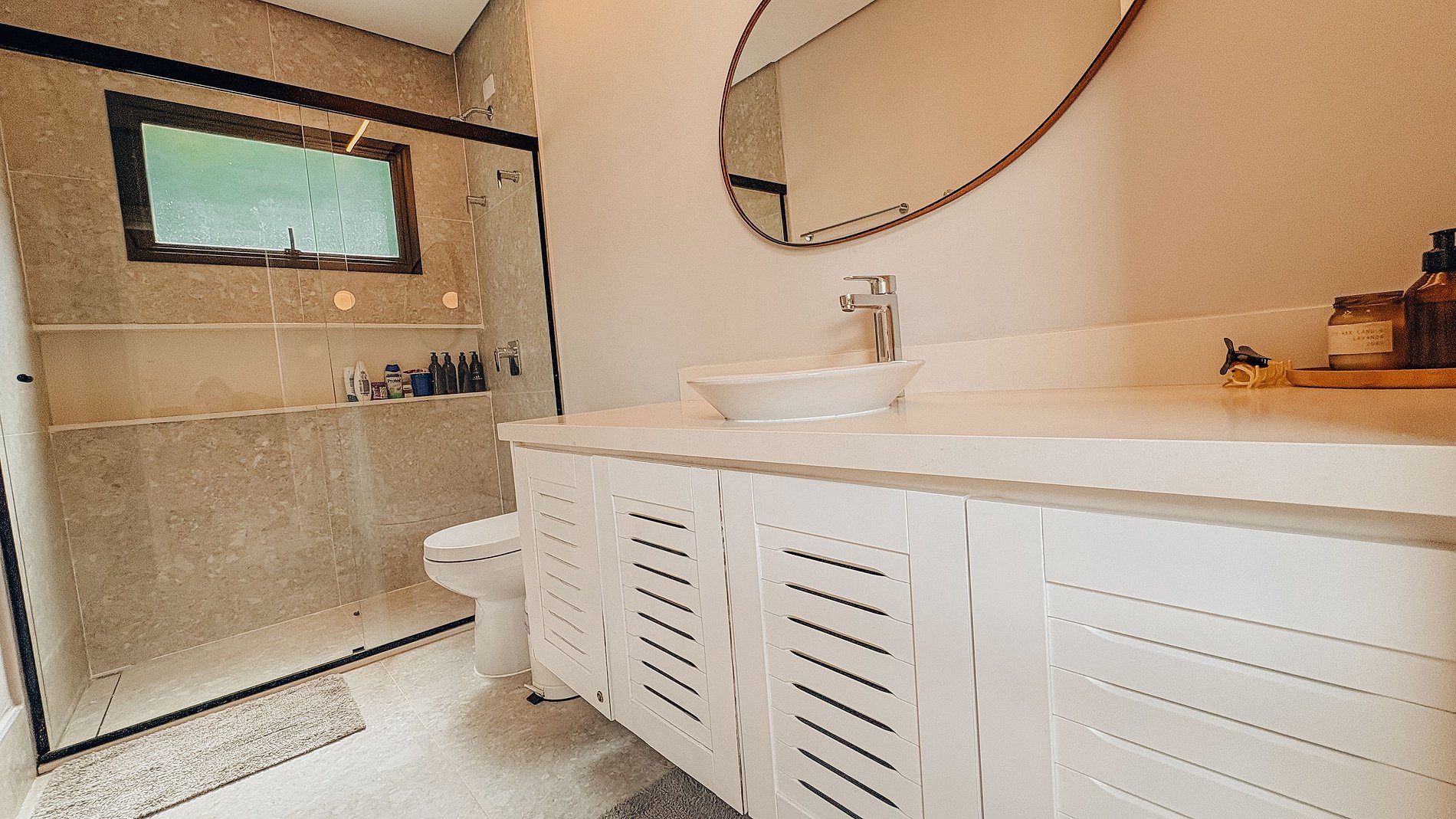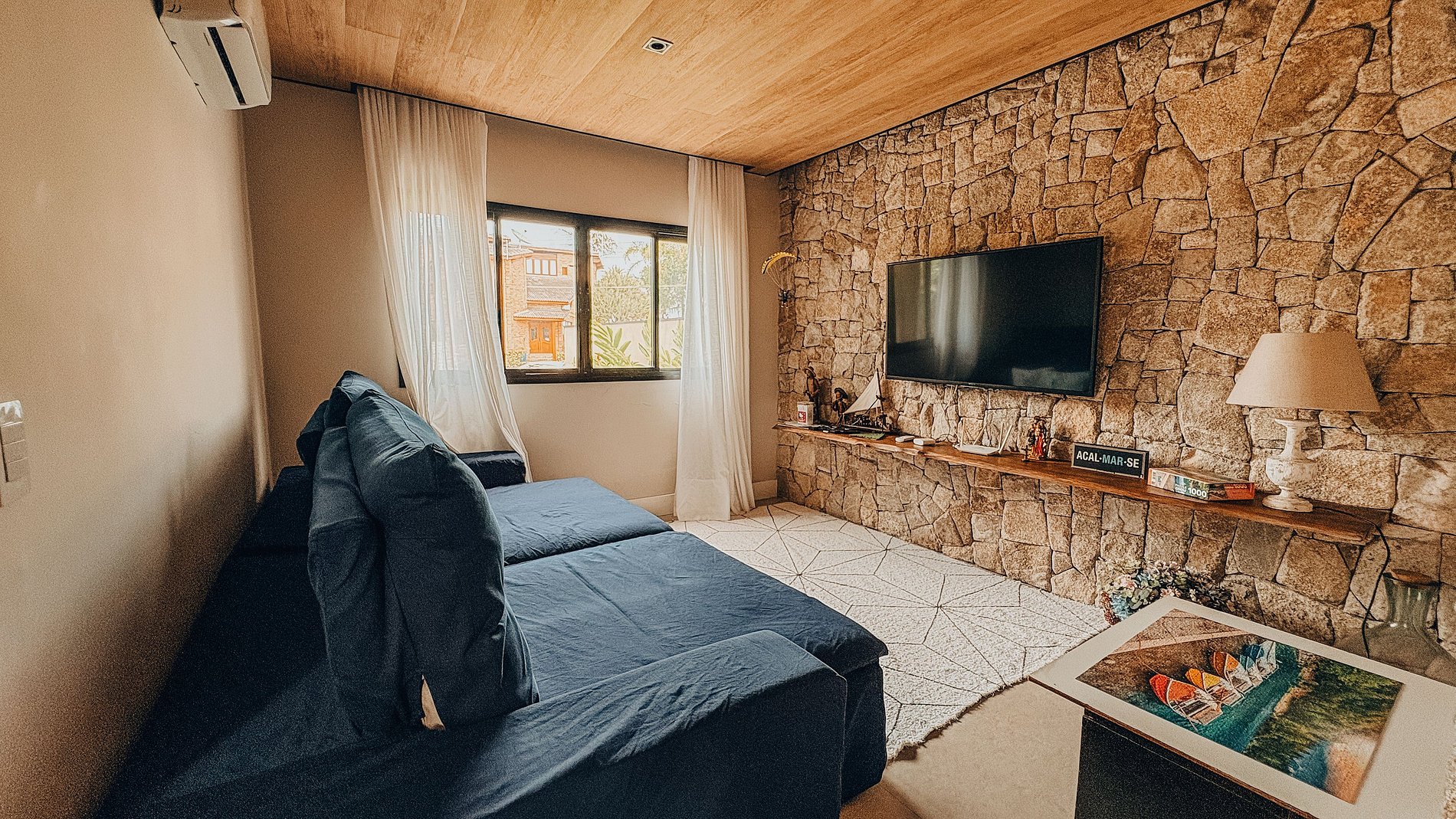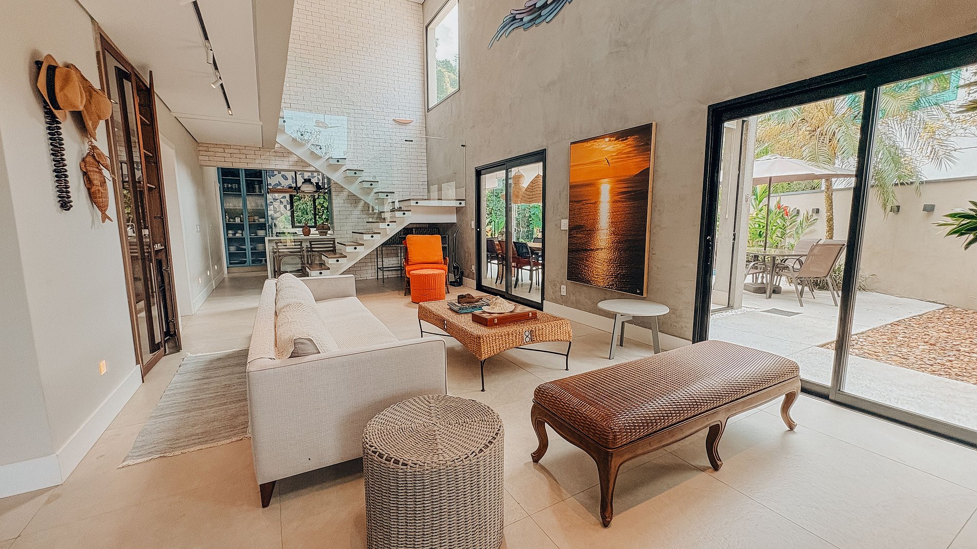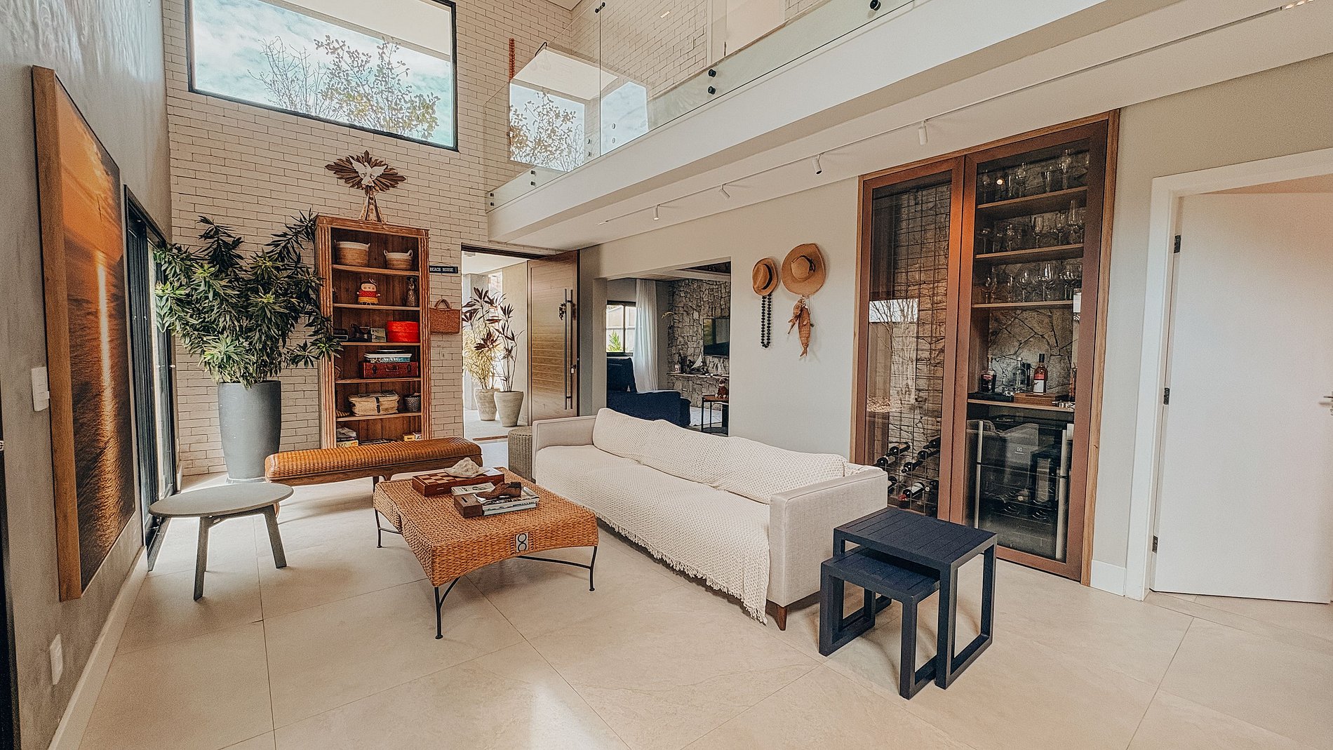 A área social impressiona pela amplitude, com sala de pé-direito duplo, muita luz natural e integração total com o exterior. Os ambientes se conectam de forma fluida, criando um espaço perfeito para convívio e relaxamento. Para momentos de descanso, a casa conta ainda com uma sala de TV climatizada, aconchegante e confortável.