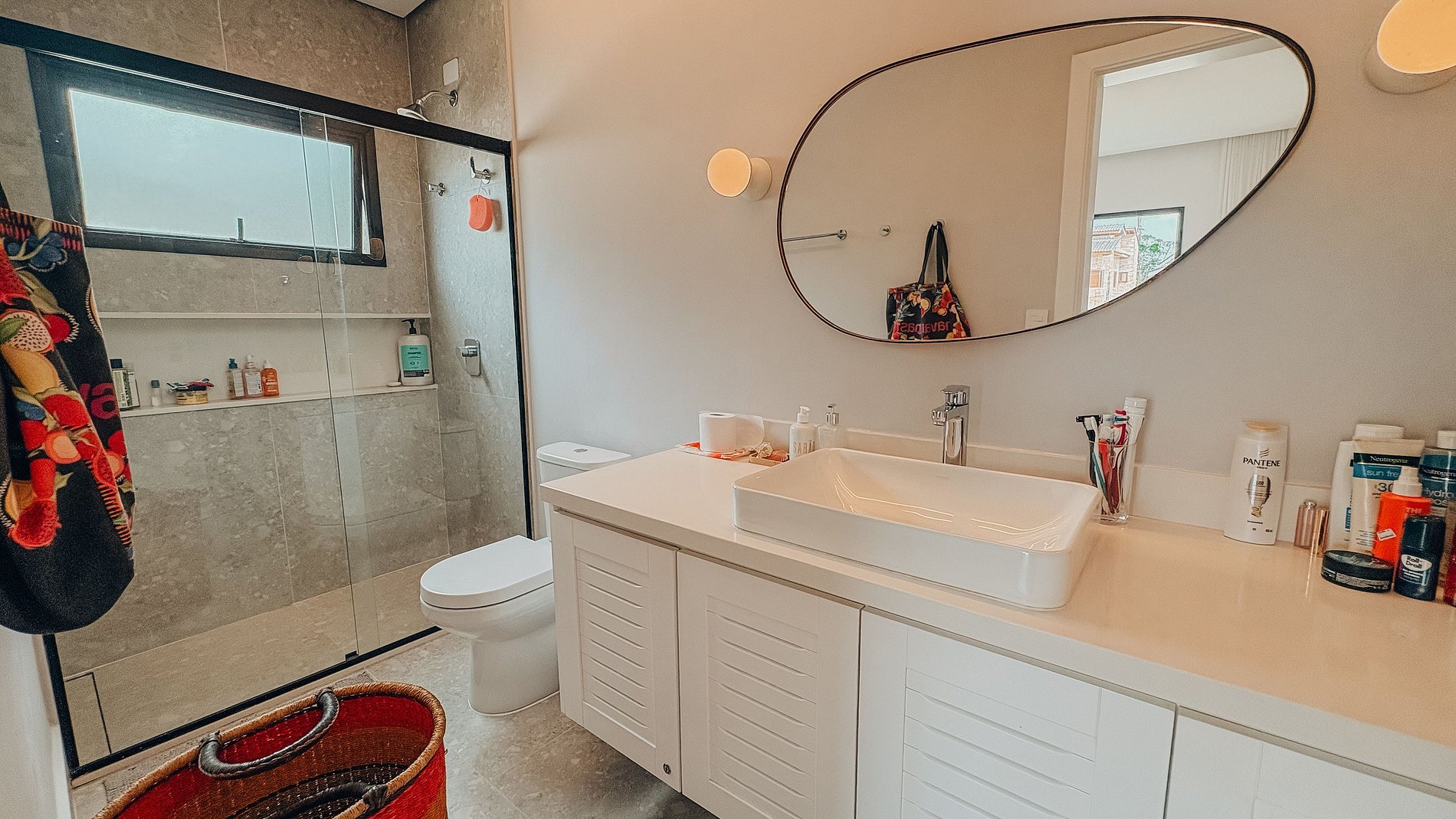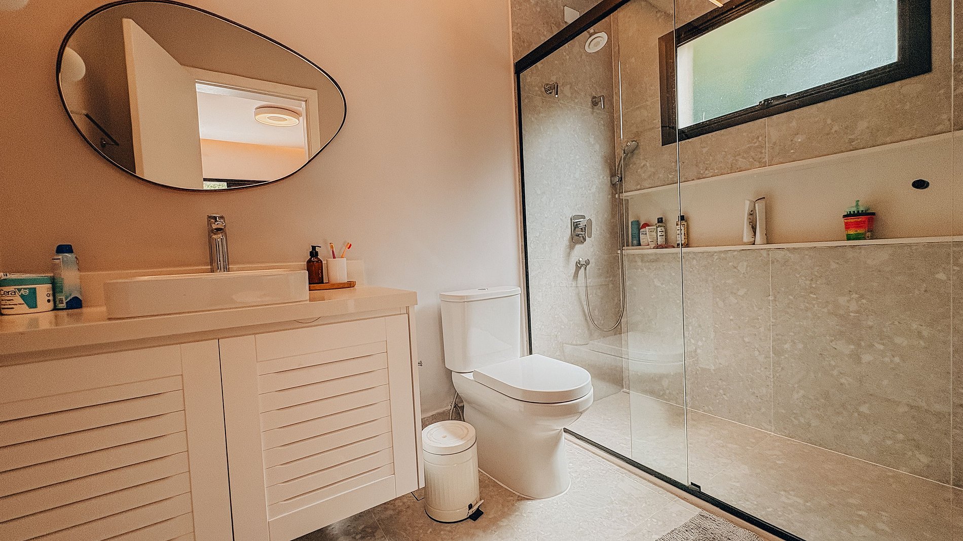 No térreo, uma suíte completa com ar-condicionado e espaço para trabalho oferece privacidade e funcionalidade. No andar superior, três suítes amplas acomodam os hóspedes com conforto, com varandas e vistas que combinam o verde da natureza com o mar ao fundo.